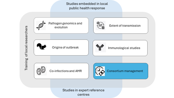 JUA KIVU: Overview of the proposal, showing 5 research work packages, project management, and the foundational work for locally embedded outbreak research, with training of local researcher (grey shaded area) and direct involvement of local public health actors (blue shared area). A small part of the studies will be performed in the expert reference labs outside the region.